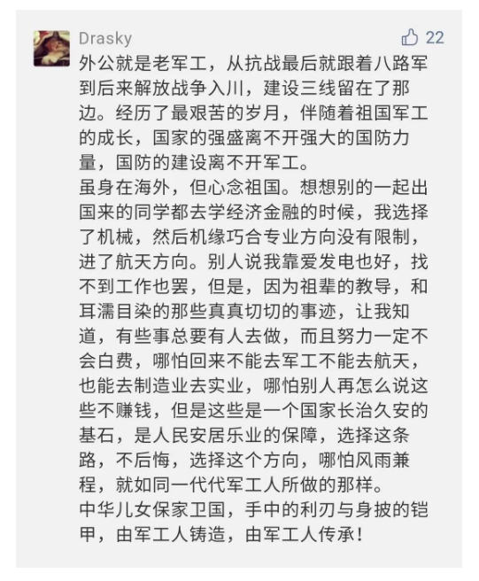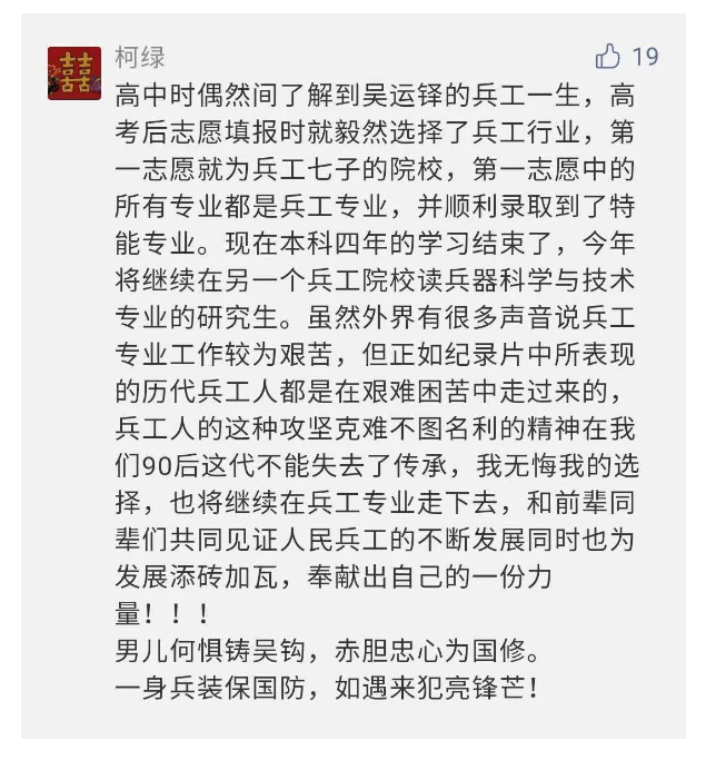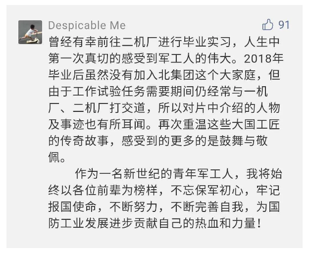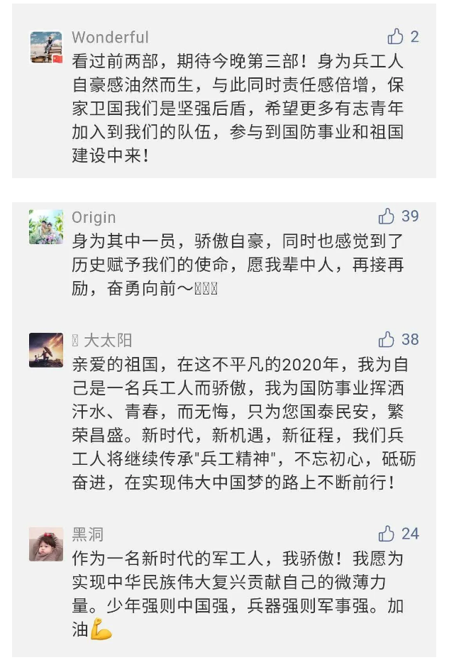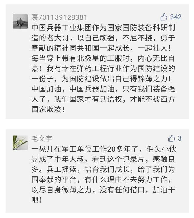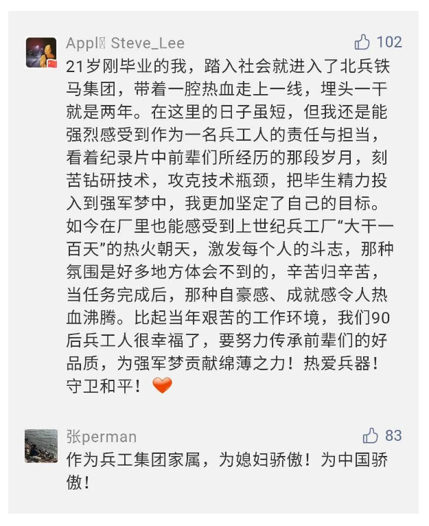 作為新時代弘揚(yáng)人民兵工精神的特色文化成果,紀(jì)錄片的播出,凝聚起廣大兵器干部職工團(tuán)結(jié)奮斗新時代磅礴力量,極大的增強(qiáng)了兵工人的自豪感,大家紛紛表達(dá)了作為軍工央企一員 “此生無悔入軍工”的使命擔(dān)當(dāng)......