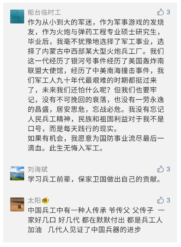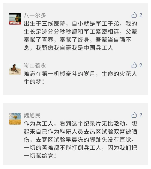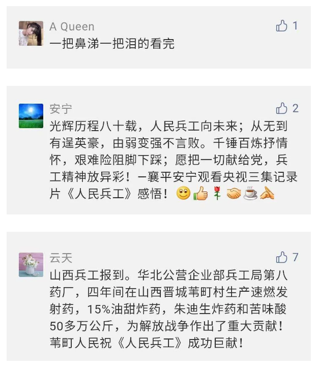 在中國共產(chǎn)黨成立九十九周年之際,由中國兵器工業(yè)集團(tuán)有限公司組織攝制、反映人民兵工在黨的領(lǐng)導(dǎo)下80余年光輝奮斗歷程、廣大兵工人弘揚(yáng)“把一切獻(xiàn)給黨”人民兵工精神的三集紀(jì)錄片《人民兵工》自7月1日-3日每晚20點在中央廣播電視總臺中文國際頻道(CCTV-4)《國家記憶》首播以來,在兵器系統(tǒng)和觀眾中引發(fā)強(qiáng)烈反響,很多網(wǎng)友、觀眾紛紛留言表達(dá)了自己的觀后感受。 觀眾在兵器工業(yè)集團(tuán)官微的留言區(qū)直抒了觀影感受,有的熱淚盈眶,有的心潮起伏,有的興起賦詩,有的認(rèn)為讓心靈得到凈化、思想得以提升,有的認(rèn)為是最直觀的國防教育教材......