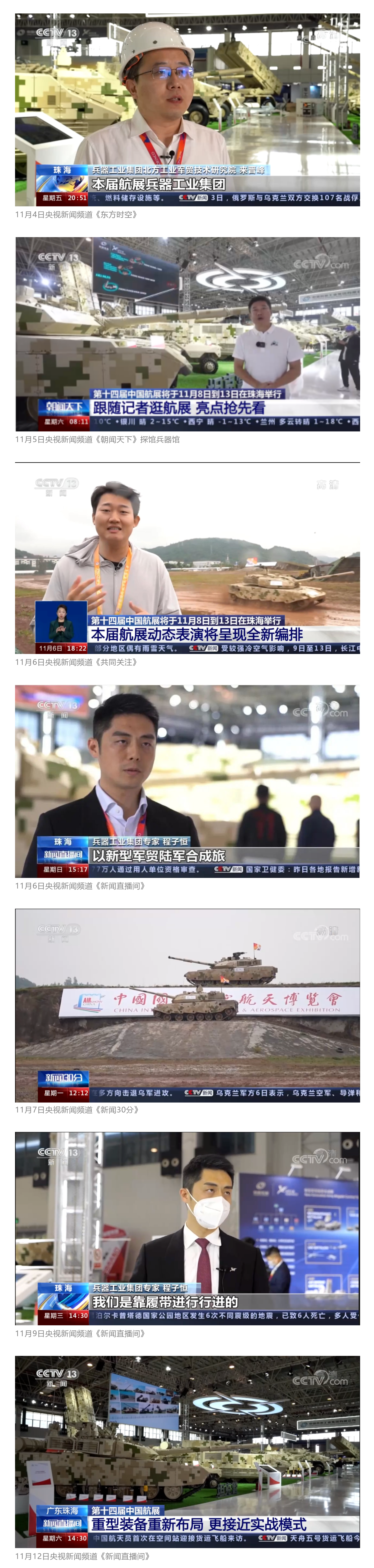 此次航展,央視新聞?lì)l道《朝聞天下》《新聞直播間》《東方時(shí)空》《共同關(guān)注》《新聞30分》《24小時(shí)》、央視國(guó)防軍事頻道《國(guó)防軍事早報(bào)》《軍事報(bào)道》《軍迷行天下》、央視國(guó)際頻道《中國(guó)新聞》《今日環(huán)球》等欄目共播出兵器工業(yè)集團(tuán)參展相關(guān)新聞報(bào)道30余條。