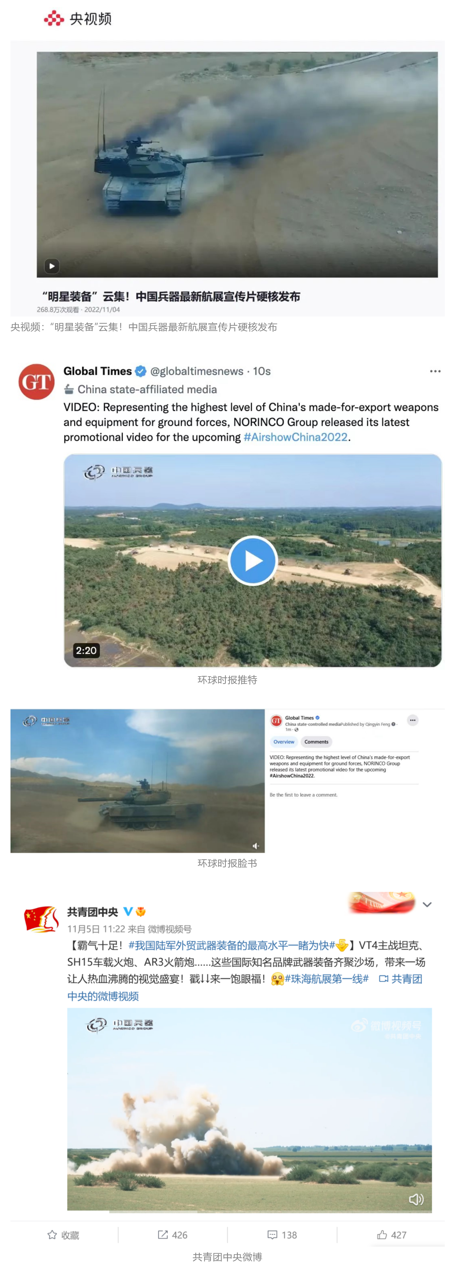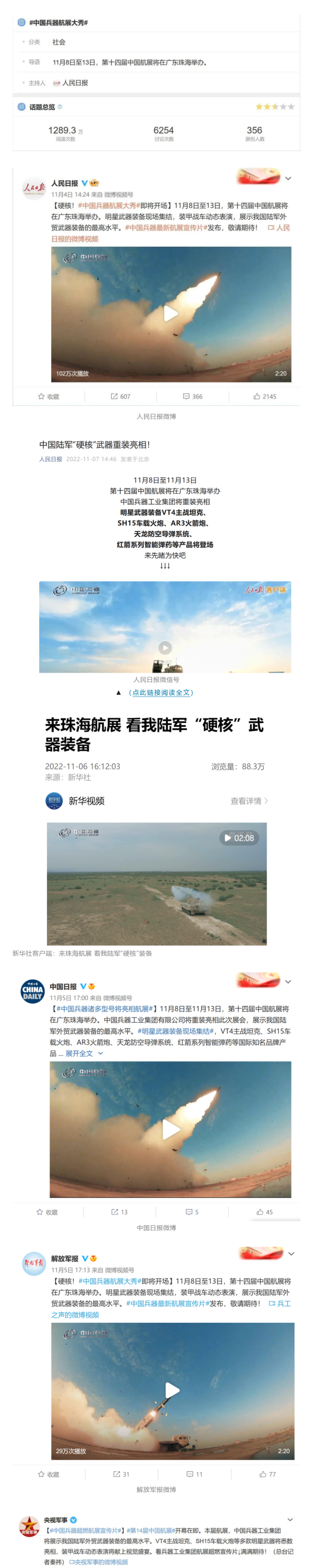 人民日?qǐng)?bào)官方微博、微信公眾號(hào),新華社客戶端、央視新聞客戶端、中國(guó)日?qǐng)?bào)微博、參考消息微信公眾號(hào)、解放軍報(bào)微博、央視軍事微博、CGTN微博、中國(guó)軍號(hào)微博、共青團(tuán)中央微博、環(huán)球時(shí)報(bào)(英文網(wǎng)站、臉書(shū)賬號(hào)、推特賬號(hào))、嗶哩嗶哩、學(xué)習(xí)強(qiáng)國(guó)平臺(tái)、國(guó)資小新視頻號(hào)、網(wǎng)易軍事、騰訊軍事、鳳凰軍事、北京日?qǐng)?bào)、東方衛(wèi)視看看新聞全媒體、北京電視臺(tái)等20余家中央主流媒體、國(guó)家部委、省市媒體的新媒體第一時(shí)間播發(fā)集團(tuán)公司航展宣傳片等視頻作品燃爆全網(wǎng),累計(jì)閱讀量突破1700萬(wàn)人次。集團(tuán)公司微信公眾號(hào)、微博、抖音號(hào)、快手號(hào)、微信視頻號(hào)、知乎號(hào)等新媒體宣傳片播放閱讀量超過(guò)800萬(wàn)人次,點(diǎn)贊超過(guò)30萬(wàn)人次。集團(tuán)公司微信公眾號(hào)推出《硬核!中國(guó)兵器最新航展宣傳片發(fā)布》《中國(guó)兵器航展節(jié)目單,請(qǐng)選出心中明星裝備》《航展首日,中國(guó)兵器閃耀亮相!》等7篇報(bào)道,閱讀量超過(guò)25萬(wàn)人次,集團(tuán)公司微信視頻號(hào)、抖音號(hào)、快手號(hào)等新媒體賬號(hào)發(fā)布“中國(guó)兵器航展大秀”系列視頻,觀看量超過(guò)330萬(wàn)人次。