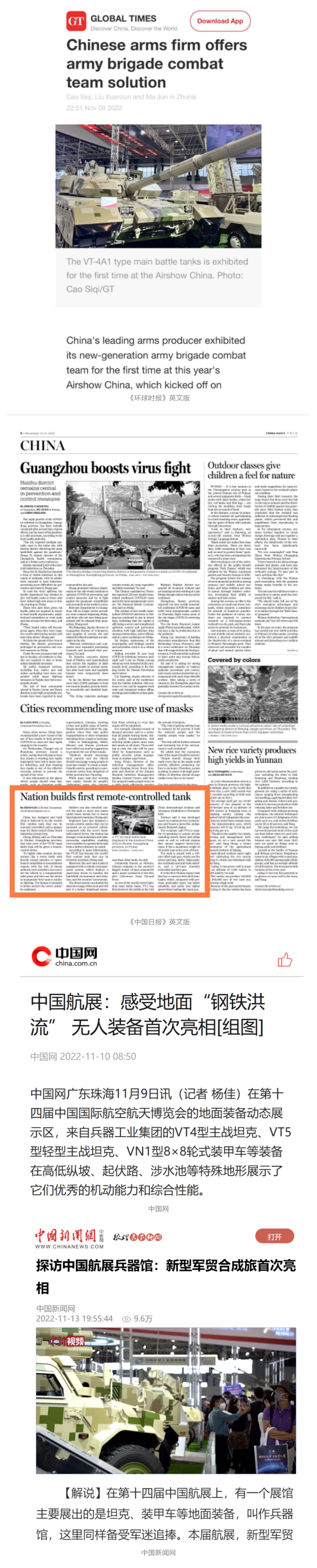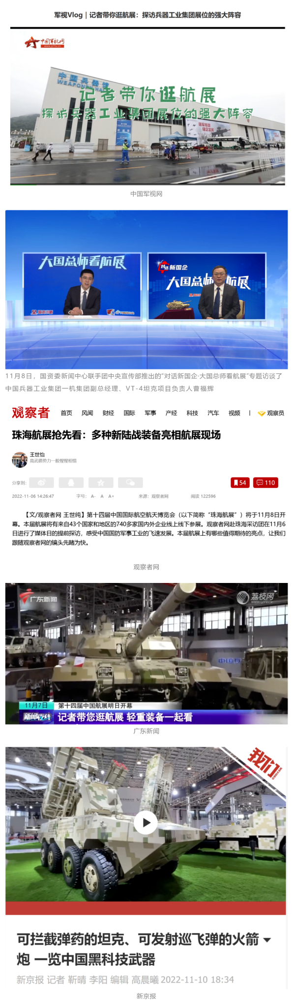 央視國(guó)防軍事頻道航展特別報(bào)道《炫舞天地間》11月12日《賞“鐵甲雄風(fēng)”!看航展地面裝備“鋼鐵洪流”名場(chǎng)面》對(duì)兵器工業(yè)集團(tuán)武器裝備特色亮點(diǎn)進(jìn)行報(bào)道?!秶?guó)防軍事早報(bào)》11月7日推出報(bào)道《第十四屆中國(guó)國(guó)際航空航天博覽會(huì)明天開(kāi)幕 中國(guó)兵器館首次以陸軍合成旅實(shí)戰(zhàn)體系形式展出》,對(duì)兵器館陸軍合成旅實(shí)戰(zhàn)體系進(jìn)行報(bào)道?!盾娛聢?bào)道》11月9日推出《第十四屆中國(guó)國(guó)際航空航天博覽會(huì) 地面兵器裝備首次聯(lián)合陸航直升機(jī)進(jìn)行動(dòng)態(tài)展示》報(bào)道?!盾娒孕刑煜隆?1月9日推出報(bào)道《軍迷打卡航展2022》以專業(yè)軍迷視角探館兵器館,全面展示兵器工業(yè)集團(tuán)參展裝備特色亮點(diǎn)。