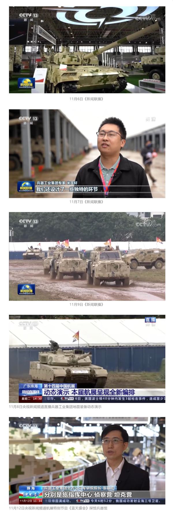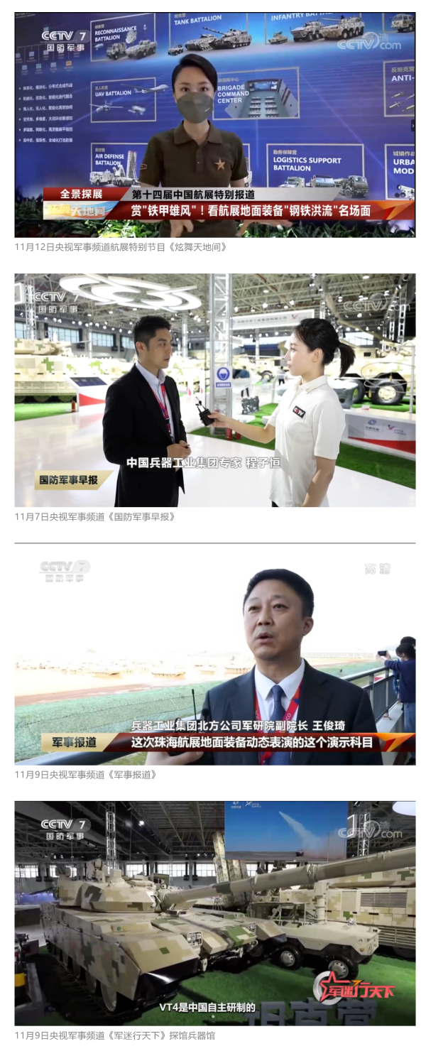 11月6日、7日、9日,央視《新聞聯(lián)播》三次報(bào)道兵器工業(yè)集團(tuán)參展情況,重點(diǎn)介紹了集團(tuán)公司總體參展情況、地面裝備動(dòng)態(tài)演示全新編排、國(guó)產(chǎn)輪式反伏擊車首次采用有人駕駛和無(wú)人駕駛混合編隊(duì)等內(nèi)容。11月8日,央視新聞?lì)l道直播地面裝備動(dòng)態(tài)演示;11月12日,央視新聞?lì)l道航展特別報(bào)道《藍(lán)天盛會(huì)》探訪兵器館,采訪兵器工業(yè)集團(tuán)嘉賓對(duì)陸軍合成旅作了報(bào)道。