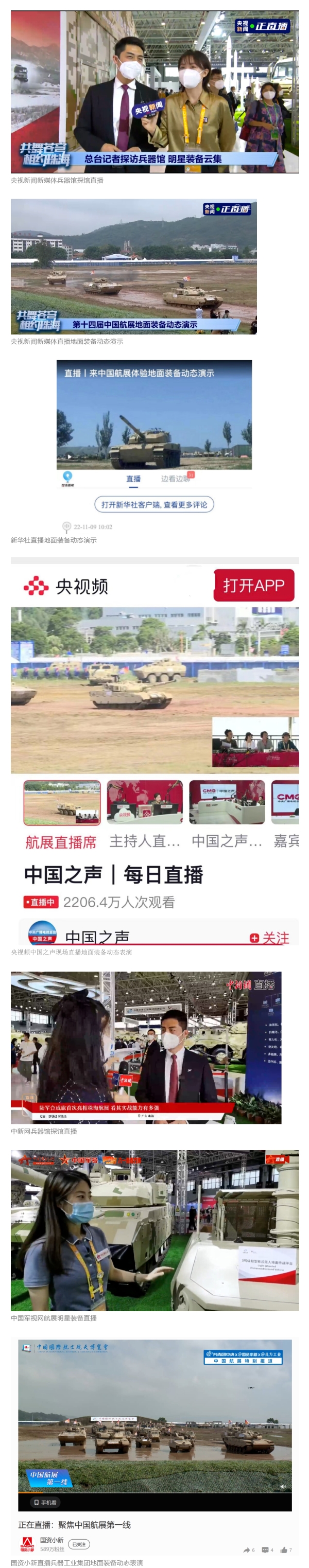 央視新聞新媒體、央視頻中國(guó)之聲、新華社、中國(guó)新聞網(wǎng)、中國(guó)軍視網(wǎng)、CGTN(微博、臉書(shū)、推特)等媒體以及國(guó)資小新、共青團(tuán)中央、鳳凰軍事等到兵器工業(yè)集團(tuán)地面動(dòng)態(tài)演示區(qū)、中國(guó)兵器館進(jìn)行了直播。航展期間,集團(tuán)公司微信視頻號(hào)、微博、抖音號(hào)、快手號(hào)共進(jìn)行8次直播,最高觀看人數(shù)突破24萬(wàn)。