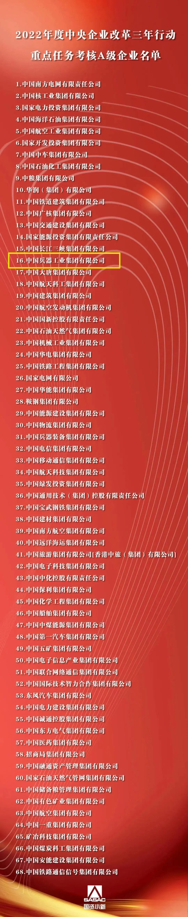 根據(jù)《中央企業(yè)改革三年行動重點任務考核實施方案(試行)》和《中央企業(yè)改革三年行動重點任務考核指標表(2022版)》,經審定,國務院國資委發(fā)布2022年度中央企業(yè)改革三年行動重點任務考核A級企業(yè)名單,中國兵器工業(yè)集團有限公司獲評A級。 來源/國資委網(wǎng)站 |
