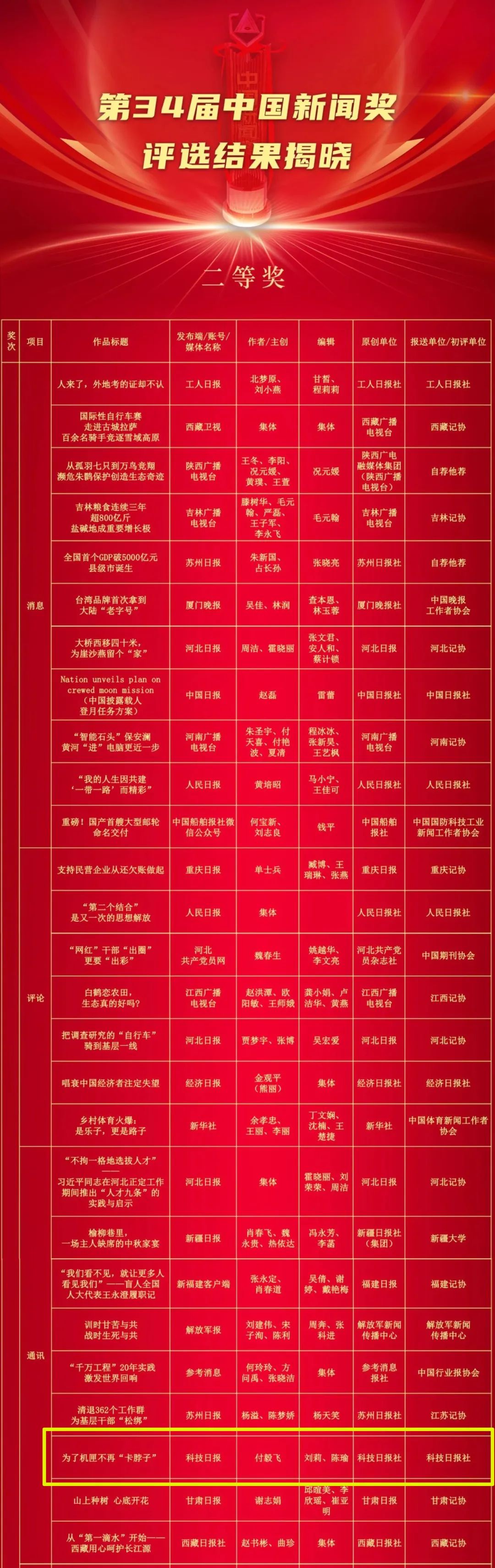近日,由中華全國新聞工作者協(xié)會主辦的第34屆中國新聞獎評選結果揭曉。來自全國各級各類媒體的373件作品獲中國新聞獎,其中,特別獎4件、一等獎75件、二等獎109件、三等獎185件。其中,《科技日報》報道中國兵器工業(yè)集團武重集團推進科技創(chuàng)新、攻關機床加工技術及裝備的通訊作品《為了機匣不再“卡脖子”》榮獲二等獎。