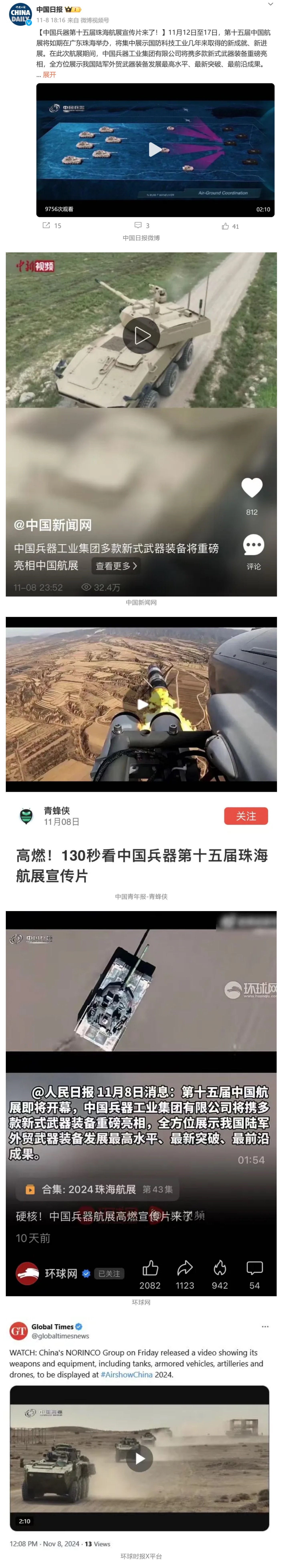 人民日報微博、新華社客戶端、央視軍事微博、中國軍號微博、央視軍事報道微博、中國日報微博、中國新聞網(wǎng)、中國青年報-青蜂俠、環(huán)球網(wǎng)、環(huán)球時報(臉書、X平臺)、學習強國中央企業(yè)學習平臺、共青團中央微博、國資委網(wǎng)站等20余家中央主流媒體、國家部委的新媒體第一時間播發(fā)集團公司航展宣傳片等視頻作品燃爆全網(wǎng),累計閱讀量突破1200萬人次。集團公司微信公眾號、微博、抖音號、快手號、微信視頻號、知乎號等新媒體宣傳片播放閱讀量近1000萬人次,點贊近20萬人次。