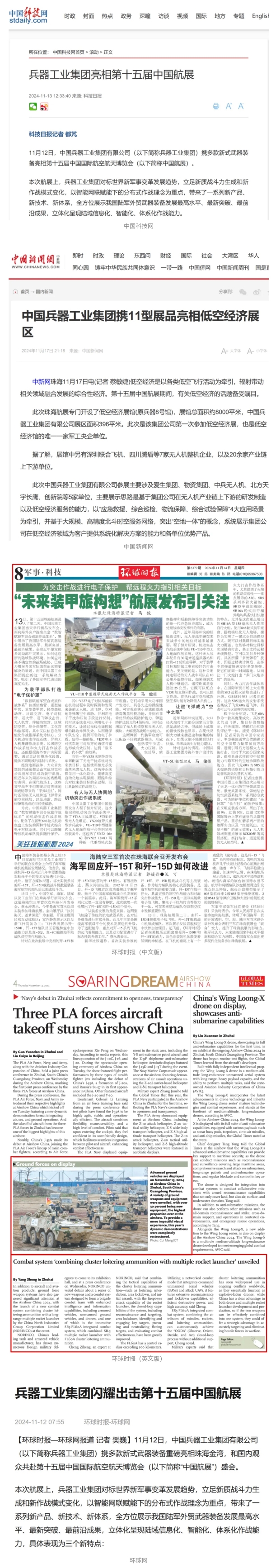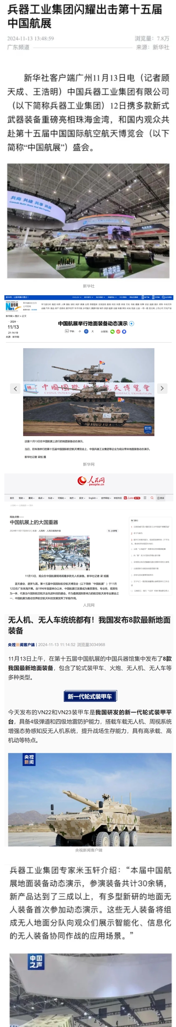 11月12日至17日,第十五屆中國國際航空航天博覽會在廣東省珠海市舉行,中國兵器工業(yè)集團有限公司突出數(shù)智賦能軍貿(mào)合成旅作戰(zhàn)體系,帶來了一系列新產(chǎn)品、新技術、新體系,全方位展示我國陸軍外貿(mào)武器裝備發(fā)展最高水平、最新突破、最前沿成果,立體化呈現(xiàn)陸域信息化、智能化、體系化作戰(zhàn)能力,受到了全社會廣泛關注。航展期間,央視綜合頻道《新聞聯(lián)播》、央視新聞頻道《新聞直播間》《長空鵬程》報道兵器工業(yè)集團參展情況,重點介紹了VT4A1主戰(zhàn)坦克、輪式裝甲火炮、新一代陸域指控信息系統(tǒng)、無人戰(zhàn)車、民用無人運輸機及地面裝備演示有關內(nèi)容。央視新聞推出航展直播節(jié)目《藍天之約》,邀請兵器工業(yè)集團嘉賓對參展情況、裝備動態(tài)演示作了講解。