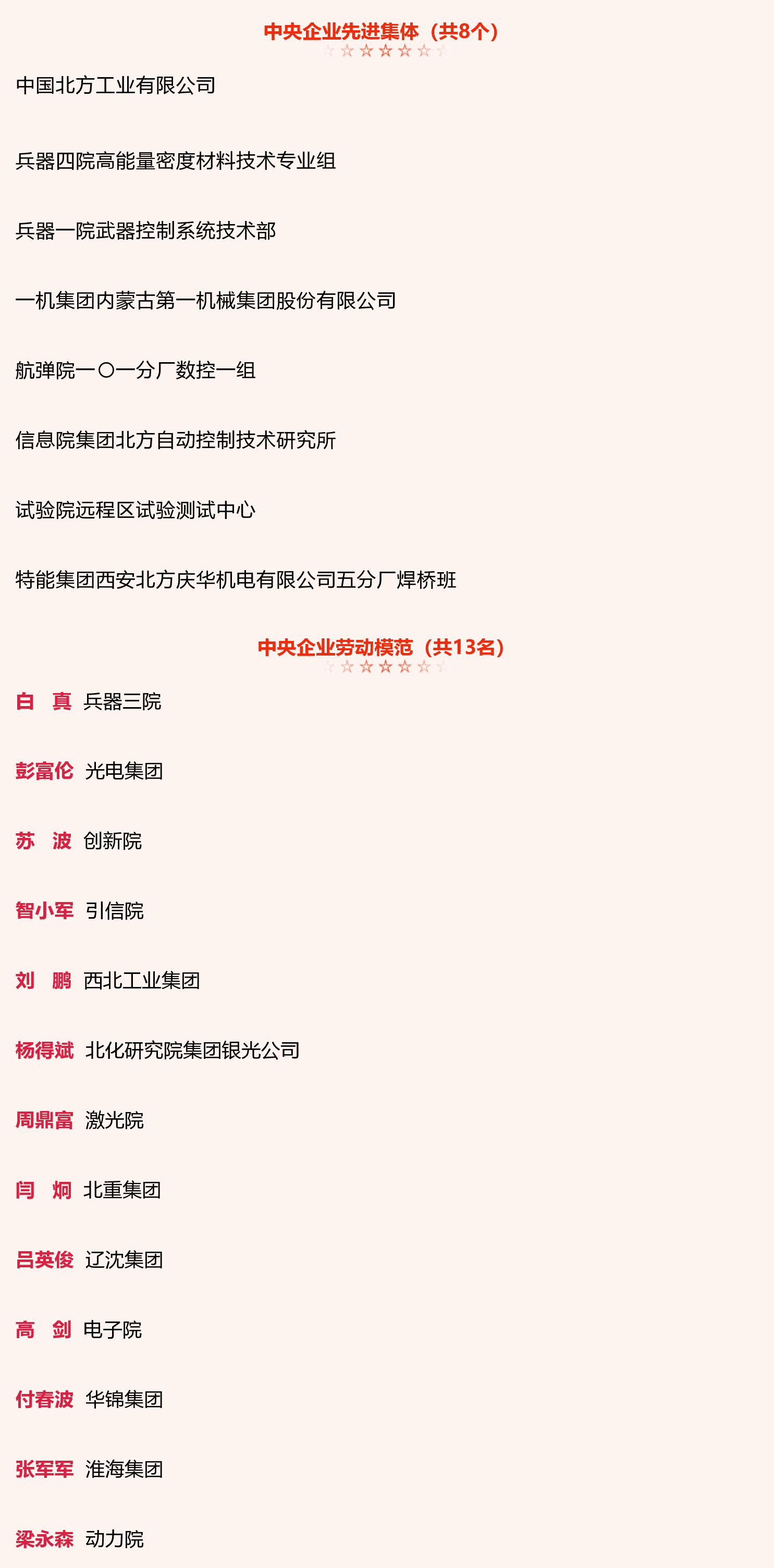 近日,人力資源社會(huì)保障部、國(guó)務(wù)院國(guó)資委發(fā)布《關(guān)于表彰中央企業(yè)先進(jìn)集體和勞動(dòng)模范的決定》并召開(kāi)表彰大會(huì),中國(guó)兵器工業(yè)集團(tuán)有限公司8個(gè)集體榮獲“中央企業(yè)先進(jìn)集體”稱(chēng)號(hào),13名個(gè)人榮獲“中央企業(yè)勞動(dòng)模范”稱(chēng)號(hào)。